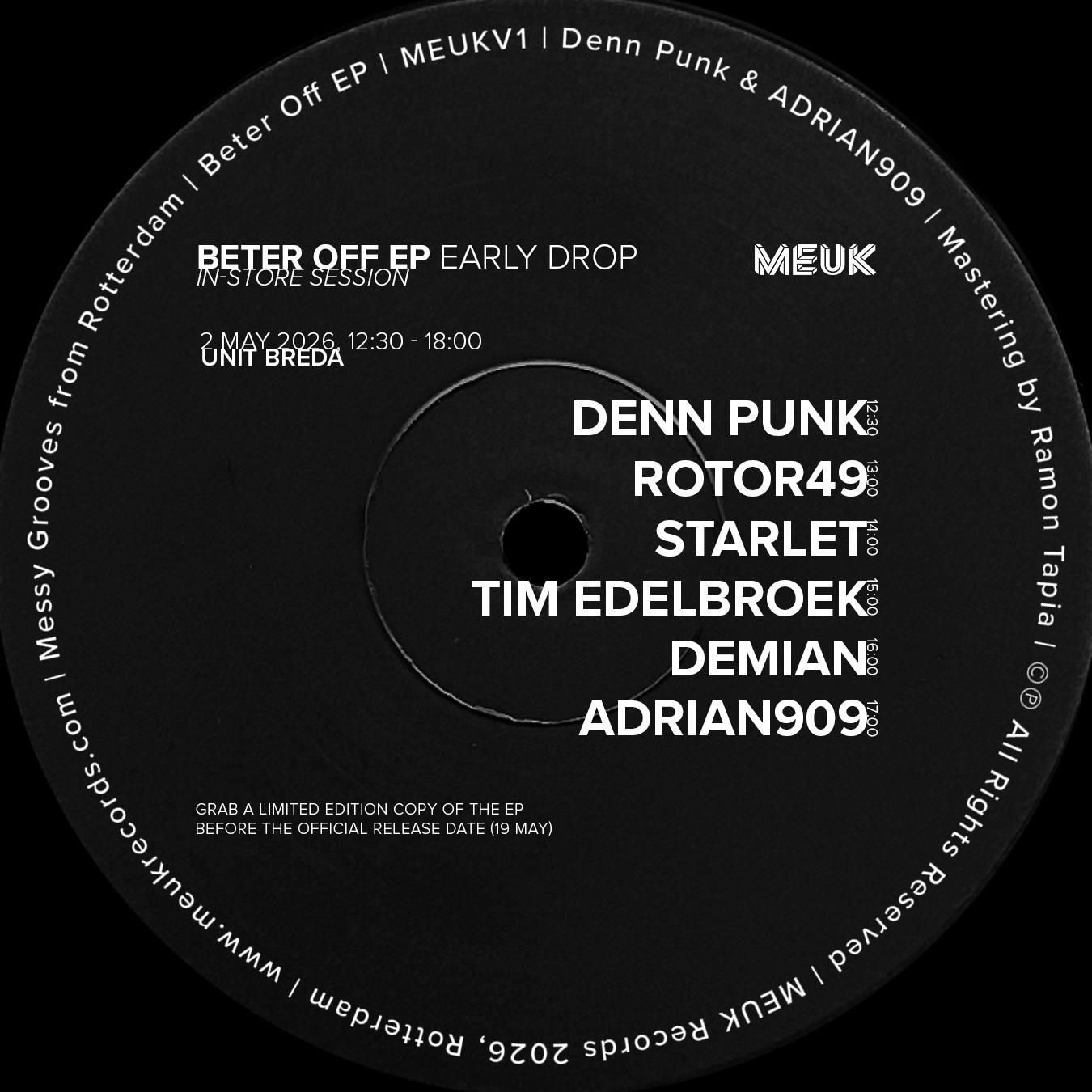 On Saturday May 2nd, we’re kicking off the vinyl release of the Beter Off EP with an In-Store Session at UNIT Breda. We have put together an amazing line-up with DJ friends (and of course Denn Punk & ADRIAN909 themselves) who will warm up the record with us.